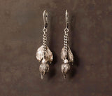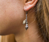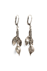 A rosebud cast in silver hangs from a short curb chain, flanked by delicate silver leaves.