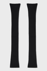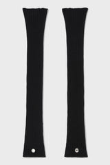 Arm warmers in black light weight rasato knit from Rick Owens fw24 Porterville. These arm warmers are long tube-shape gloves, without hands. They feature a discreet hole for the thumb and a visible silver snap to attach the pair together. This is a lightweight and soft classic stitch cashmere knit.