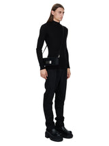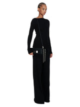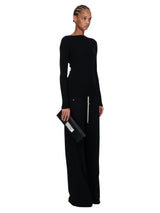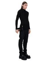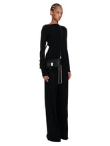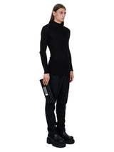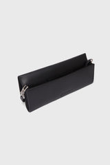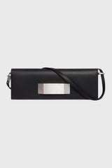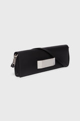Baguette clutch in black groppone cow leather from Rick Owens fw24 Porterville. This baguette is a long rectangular shape, structured, bag with a flap with a palladium indented easy-grip bevel and magnetic closure. It has one main inner pocket with flat back pocket, and a second slim pocket with 2 card slots. It features a long thin leather strap with a palladium tone brass hook which ties on one side, or can be detached to create a clutch.