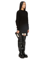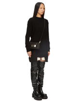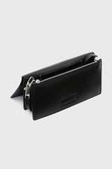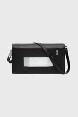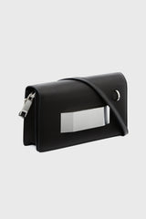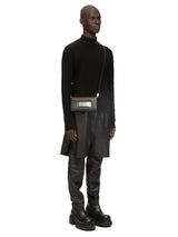 Griffin in black soft grain cow leather from Rick Owens FW24 Porterville. This griffin is a small rectangular bag with a front flap with a palladium indented easy-grip bevel and magnetic closure. It has one ponticello d-loop on front, an inner pocket with 9 card slots and a second inner zippered pocket. It features a long thin leather strap with a palladium tone brass hook which ties on one side, or can be detached to create a clutch. This mediumweight cow leather has a subtle grain texture and natural handfeel.