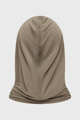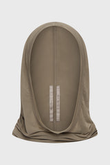 Jera hood in dust stretch cupro jersey from Rick Owens SS25 Hollywood runway. This jera hood fits over the head like a snood with an open face. It can be worn as a hood or down around the neck as a scarf face, and has a ribbed edge.