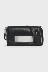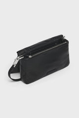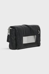Pillow griffin in peached lambskin from Rick Owens. This pillow griffin is a small rectangular, soft padded, bag with a front flap with a palladium indented easy-grip bevel and magnetic closure. It has one ponticello d-loop on front, an inner pocket with 9 card slots, and a second inner zippered pocket. It features a long thin leather strap with a palladium tone brass hook which ties on one side, or can be detached to create a clutch. This leather is lightweight and has a soft natural peachskin handfeel.