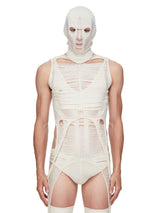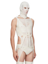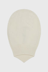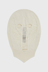 Skull in dinge shredded merino knit from Rick Owens ss25 Hollywood runway. This skull is a balaclava that covers the head and neck with rounded openings for each eye, and the mouth. It features shredded knit over the nose, cheeks and chin.