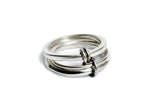 Silver wire tracing a lying 8, the symbol of infinity, connects a square ring, a fine round ring and a forged ring.