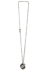 Four rings entwined vary in size and style: The largest ring is treated with silversmith hammer, the next has fragments of words embossed. Of the small rings, one is plain polished, the other shows linear traces.