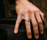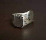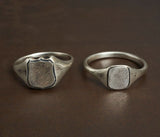Its roughly filed, blackened surface is a counterpoint to the plain signet of the other ring, yet, both pieces are scratched all over, as if worn for years