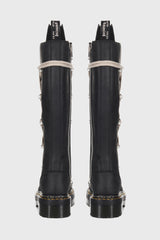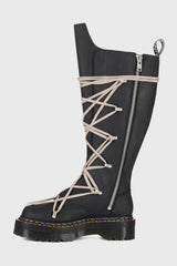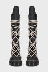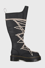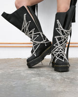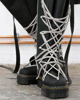 1B60 Quad Sole Pentalace Boot in oily nubuck cow leather from Dr. Martens x Rick Owens FW25. These Dr. Martens iconic 1B60 boots are reimagined by Rick Owens and have pearl pentalace lacing and palladium finish hardware, including tunnel loops and side zipper. The boot features an extended geometric tongue and has a woven dr. Martens airwair heel loop in black and pearl. They have a quad sole with a yellow and pearl welt stitch.