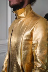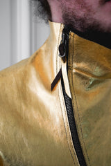 24K gold deconstructed horse leather jacket from Leon Emanuel Blanck, featuring slim fit, asymmetrical cut, contrast zip-up closure, 24k gold foiled surface, tonal stitching.
