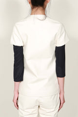 White faux leather short sleeve jacket from Roni Ilan, featuring regular fit, zip-up closure, round neck, short sleeve construction, tonal stitching.