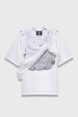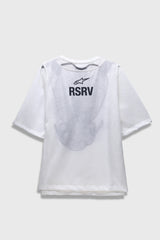 A1 shortsleeve tee in white from Alpinestars RSRV. An exercise in layers and an exploration of duality, the A1 SS TEE is a t-shirt/tank top hybrid inspired by motocross armor and built with fireproof fabrics. The short-sleeved box-bodied Nomex mesh t-shirt features a tonal screenprint of an Alpinestars A-1 Chest Protector—a favorite of professional MX athletes. A semi-opaque tank top (also constructed from Nomex mesh) is layered over the t-shirt, implying hidden strength, layered complexity, and an underlying juxtaposition of durability and vulnerability. The layering also alludes to an X-ray image as well, further referencing the journey to recovery theme of this collection.