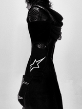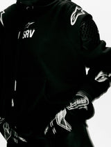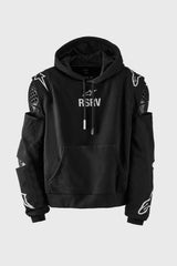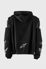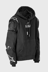 Armor hoodie in black from Alpinestars RSRV. The Armor Hoodie is an exaggerated, casual, broad-shouldered, armored, and imposing garment. It utilizes an array of protective and performance components from the Alpinestars automotive and motorcycle collections. Tucked under the iconic Astar-branded epaulets (inspired by Alpinestars auto suits) are shoulder protectors repurposed from deadstock Bionic Action Protection Jackets. The Bionic Protection elements extend into the elbows, integrated into the 17.5-ounce, 100% cotton, mesh-lined sweatshirt silhouette. The oversized hood is finished with Alpinestars-branded drawstring pulls. Oversized hooded fleece Enhanced with repurposed deadstock Bionic Action Protection JacketsMesh-lining Exposed shoulders and elbows reveal protective pieces Shoulder logos inspired by Alpinestars race suits and team wear Drawstrings finished with branded metal draw pulls