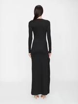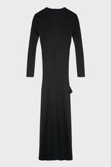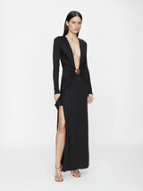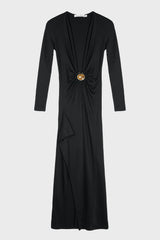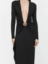 Mineral stone cascade longsleeve dress in black from Christopher Esber. Cut in a fine rib jersey, the Mineral Stone Cascade Long Sleeve Dress features a deep V neckline, gathered draping through the waist and a circular hardware accent at the centre front. A domed mineral stone is set in gold-toned hardware, anchoring the silhouette with sculptural weight.