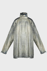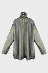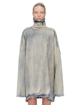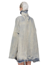 JUMBO TABARD MINERAL PEARL from Rick Owens DRKSHDW. This jumbo tabard is below hip length with a jumbo boxy fit. It has long sleeves, and low shoulder seams. It features a high collar with a centre back opening with snap closures and a raw cut hem, neck and sleeves.