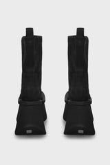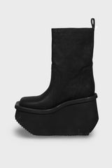 Factory boots in black greywolf nubuck leather from Rick Owens AW25 Concordians runway. These factory boots are mid-calf height. They have a topstitched seam arcing over the front foot with stitching running over the anterior ankle. They feature an angular heel counter and a back loop pull tab and have 14cm high shark-tooth sole underneath and at front and have a slanting heel and inclined toe platform.