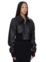 Dracucollar cropped in black veg nappa lamb from Rick Owens AW25 Concordians runway. This dracucollar cropped is waist length with long sleeves and a dropped shoulder. It has a centre front zipper closure and a wide ribbed waistband cuffs and a concealed zipper pocket in the left forearm. It features an extended length collar that can be worn up or down and holds its shape thanks to it being reinforced with fusing material. It is fully lined and has two internal zippered pockets.