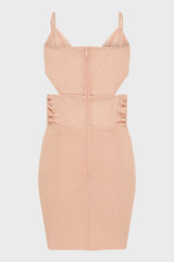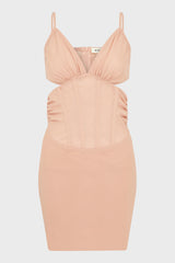 Mesh corset mini dress from MISBHV, with slim, adjusted straps in blush. Has an upper corset part with ruffling and decorative cutouts under the bust. Back zip fastening.