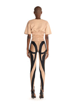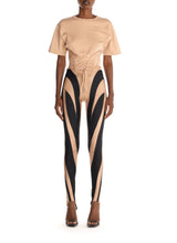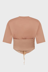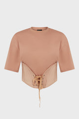 Tan corseted t-shirt from Mugler, it is corseted with drawstrings with rounded neckline.