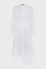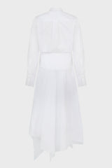 White poplin dress from Mugler, it has asymmetric lower hemline, draped effect and button closure.