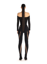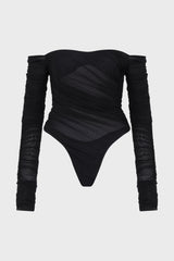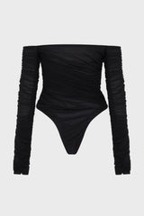 Black ruched mesh bodysuit from Mugler, it has long sleeves, off-shoulder and draped effect.
