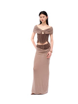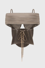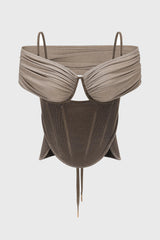 Deconstructed bustier top from OUDE WAAG. This top is paneled with lyocell–wool blend and premium Japanese corduroy.the lyocell–wool blend is soft, breathable, and has plenty of stretch while the premium Japanese corduroy has a refined texture which is carefully washed for a retro effect. The draped shoulder design of this top, together with cut-out details, offers subtle coverage while accentuating the shoulders and neckline.the bustier-inspired construction with curved hem,sculpts the body’s natural lines and creates a flattering shape. style yours for a refined and striking look.