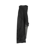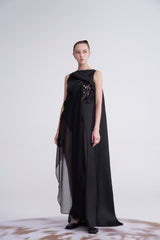 Black organza structured dress is made of silk paneled with chiffon and imported Japanese lace fabric; the piece's rotating design incorporates the element of dreamy vortex, with a rich and layered structure; the softness and lightness of the chiffon collide with the stiffness of the silk fabric, and the coarse lace fabric is veiled, with the overall fabric matching both softness and rigidity, interpreting a variety of visual touch.