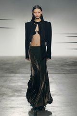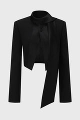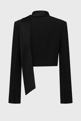 Tailored tie-detailed cropped blazer from OUDE WAAG. This tailored tie-detailed cropped blazer is crafted from sustainably sourced Japanese triacetate fabric. the smooth, draping texture is complemented by a subtle matte finish, offering a rich tactile feel. its cropped design creates an elongating effect.the neckline of this blazer is adorned with a flowing tie that boasts a delicate, luxurious sheen. wrap it elegantly around the neck to add a distinctive touch of personality, making it even more versatile.