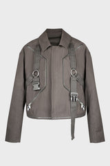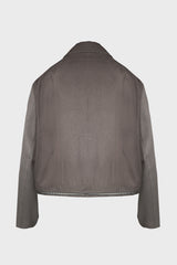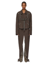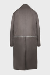 Blixa jumbo mac in ash cotton whipcord from Rick Owens AW25 Concordians runway. This blixa jumbo mac is below knee length with long sleeves and a square fit. It has a classic collar and a centre zipper opening, blixa two-way zippered chest pockets and two lower flap pockets on front as well as the harness detail on front chest. It features the it features a zip hem, allowing pieces to be converted into longer or shorter garments. This blixa jumbo mac is coat length but can be unzipped into a cropped piece. The zips can also be partially undone, allowing the bottom half to drape behind. It has a centre back vent. It is fully lined with two internal zippered pockets. This version has contrast leather top and virgin wool lower half.