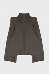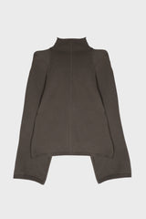 Con top in darkdust wool from Rick Owens AW25 Concordians runway. This con top is hip length with a boxy fit. It features long, wide, sleeves and firmly shaped shoulders and a slight funnel neck. It has a centre front seam line and a signature knit channel running down the spine.
