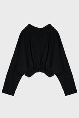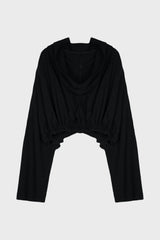 Cropped hooded tunic in black wool sable from Rick Owens AW25 Concordians runway. This hooded tunic is cropped length with long sleeves. It has a large hood that drapes at the front neck. This version has a loose body fit.