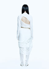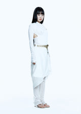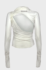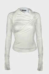 Tied long sleeve top in white from Hyein Seo. Layered panel design that passes through the logo rubber label, wrapping around the neck and shoulders and tying like a shoulder strap, Shirring detail along the neck and shoulders, Cutout on the back panel, Thumbholes on the sleeves.