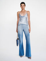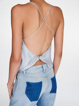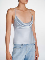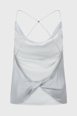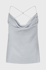 Rivet cowl cami in dark steam from Dion Lee. It is a cowl neck cami top cut in a silk viscose blend charmeuse. Bias cut for a flattering draped fit. Open back with twisted hem and fixed crossover rouleau straps. Detailed with silver screw rivets. Fully lined.