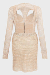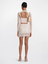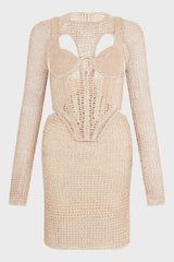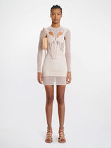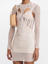 Cream marle stirrup crochet mini dress from Dion Lee. Two-piece long sleeve mini-length crochet knit dress. Featuring a separate corset bodice with integrated monowire and boning. Designed with a crew neck collar, and handkerchief hem. Dress and corset interweave at bust to create cut-out details. Stretch rib straps and cups for support. Silver-tone metal zip and hook and eye closure at back. Tonal binding throughout. Crocheted from a soft viscose-blend yarn for a slim fit. Hand-applied technique.