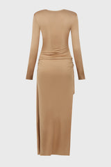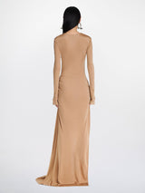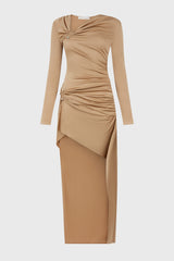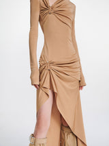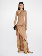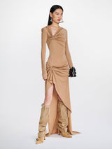 Gathered bolt longsleeve dress in timber from Dion Lee. It is an asymmetric longsleeve dress cut in a lustrous viscose jersey. Fabrication has a slinky hand and drapes effortlessly over the body. Neckline and hip is gathered along signature bolt hardware. Cut for a mini length at front with a full-length trailing hem. Invisible zip at side seam.