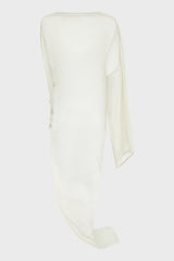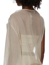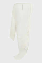 Edfu gown in silk chiffon from Rick Owens SS23 EDFU. This edfu gown is full length. It has a loose square cut body with a boat neck and level shoulder seams, it has one long sleeve on the left with an opening in the shoulder seam from which the arm can exit, creating a cape sleeve. It is open on the right side torso and drapes into a twist on the right hip, before tapering to the floor with a long train. It can also be worn toga like, with the top asymmetrically across the body, and the head and shoulder coming out of the open side.
