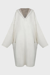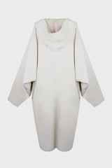 LS kaftan knee in milk/pearl double camelfrom Rick Owens AW25 Concordians runway. This longsleeve kaftan knee is knee length with long, wide sleeves. It has a large hood with a v neck and seam running down the centre front and back. It is a voluminous kaftan shape, with a wide shoulder falling into a dropped armhole.