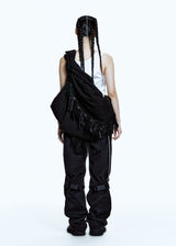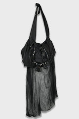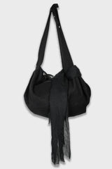 Folded scarf bag from Hyein Seo. It is a versatile bag that can be worn as either a crossbody or shoulder bag, front snap button allows for a folded shape, decorated with scarf detail, adjustable strap length with additional snap buttons.