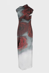 Logo printed dress from Jean Paul Gaultier. It is a Long draped red satin dress with “Blurry Roses” print and draping detail in back. It has Semi-slim fit, Invisible zip fastening on left side, Cufflink fastening with Jean Paul Gaultier engraving in back
