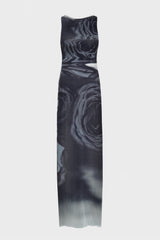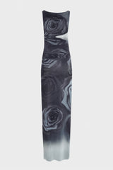 Mesh boat neck long dress sleeveless printed "Blurry roses" from Jean Paul Gaultier. It has Tight fit, Boat neck, Stretchy material and Tulle lining.