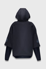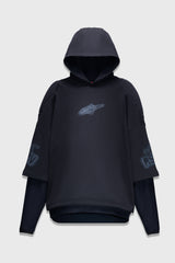 Discharged hoodie from Alpinestars RSRV. The DISCHARGED HOODIE is an exaggerated outerwear piece with an oversized hood, layered sleeves, and a hyper-relaxed fit. It presents as 2 pieces, with the mid-length oversized sleeves revealing more fitted mesh sleeves with thumb openings beneath. It envelopes the wearer with its substantial heavyweight cotton material and the soft armor shoulder inserts create volume and breadth. Astar and RSRV logos are screen printed at the chest and sleeves in a tonal, overspray stencil effect.