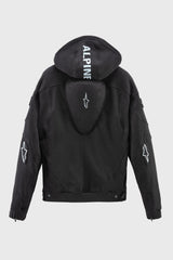 GP hoodie in black from Alpinestars RSRV. The GP Hoodie is the answer to the question — what if a top-of-the-line leather Alpinestars race jacket, but a fleece hoodie instead? It is the embodiment of the MOMENTUM collection’s exploration of form and function. It takes the function of a hyper-technical jacket and reimagines it in a casual form. Semi-rigid protective pieces have been stitched into the arms, elbows, and abdomen. Zippered cuffs and waist snaps have been borrowed from the leather jacket playbook. Race-inspired contrast stitching connects the contoured panels. But the centerpiece of technical interpretations is the speed hump that has been affixed to the back. Normally adorning the backs of high-end and professional racing suits (including those of MotoGP athletes) and jackets for aerodynamic advantage, the Momentum Hoodie’s speed hump is purely aesthetic. But is also a perfect perch for the substantial hood. Alpinestars RSRV and Astar logos round out the race-inspired branding and a robust, oversized fit confirms its street-inspired styling.