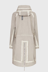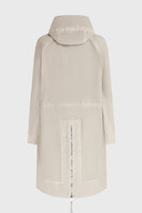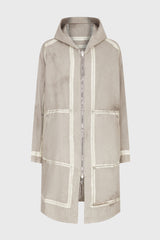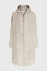 Long parka with hood in waxed cotton and object dyed. This jacket is fully reversible, featuring seam-taped details on both sides. One side includes shoulder straps and drawstring at waist. Two-way zipper closure at center front. Side welt pockets on both sides, one side with zip.