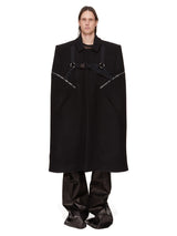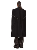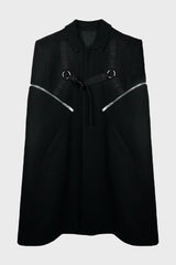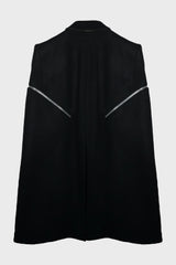 This blixa cape is below knee length and sleeveless. It has a concealed centre front zipper and fits comfortably over the shoulders. Its front harness and clip ensure it holds in place. It features two-way, above-elbow, blixa zippers that go from front to back. When unzipped the arms can be freed from inside the cape. It has side pockets and is fully lined, and has internal zippered pockets.