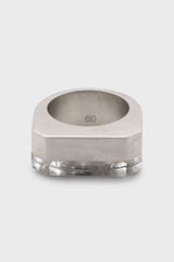 Double crystal hollywood ring in palladio brass and hematite stone from Rick Owens FW25 Concordians. This double crystal hollywood ring is a double width band with beveled edges. One side is palladium and the other crystal. It has the rick owens logo engraved on the underside.