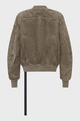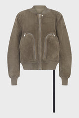 Bauhaus flight in dust foil jumbo corduroy from Rick Owens DRKSHDW FW24 Porterville. This bauhaus flight is below waist length and has long sleeves. It has a centre front zipper with placket and top snap, level shoulder seams, a back yoke and ribbed collar, cuffs and hem. It features side seam pockets, overlayed with two signature rounded bauhaus zippered pockets. It is fully lined and has two internal pockets with snaps.