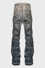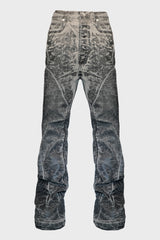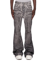 Bolan bootcut in black washed foil denim from Rick Owens DRKSHDW FW25 Concordians. This bolan bootcut is a high waisted, slim fit 5 pocket jean with a floor-length boot cut. They close with a waist button and concealed button fly. They have a waistband with belt loops and pocket rivets and back patch pockets with topstitching.
