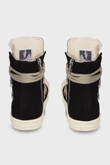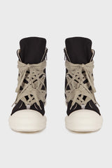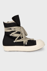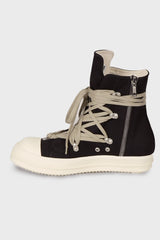Megalace sneaks in black/milk/milk 13oz overdyed denim from Rick Owens DRKSHDW AW25 Concordians. These megalace sneaks are above-ankle height and feature seven eyelets, megalace detail, a zipper on the inside ankle for easy fastening, toe caps and shark-toothed bumper soles.