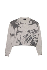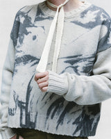 Classic fit crewneck sweater in chunky wool. Printed artwork front. Rib knit neck, hem, and cuffs.