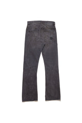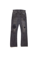 Flare jeans in 14 oz cotton antique japanese denim. Mid-rise. Five-pocket styling. Button fly. Belt loops at waistband. Logo-branded brass hardware. Embossed logo patch at back waist. Patchwork detail at front with hand repairs. Signature vintage wash process. Heavy distressing throughout.