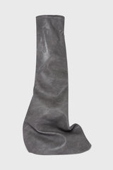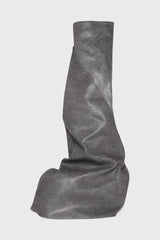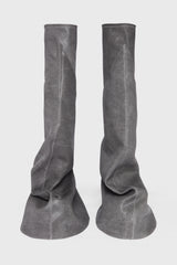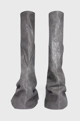 Fetish in dust/milk/milk overdyed foil stretch denim from Rick Owens DRKSHDW ss25 Hollywood. These fetish sneaks are knee high. They have a boot shaped upper with an additional layer falling from an asymmetrical seam line, grazing the floor. They have milk toe caps and shark tooth soles.