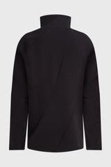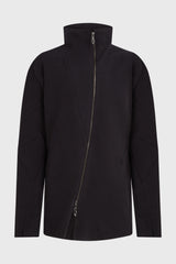 Distortion strait jacket in black heavy cotton jersey from Leon Emanuel Blanck featuring with asymmetrical stitching, regular fit, two pockets, exaggerated elbow and two-way zipper.